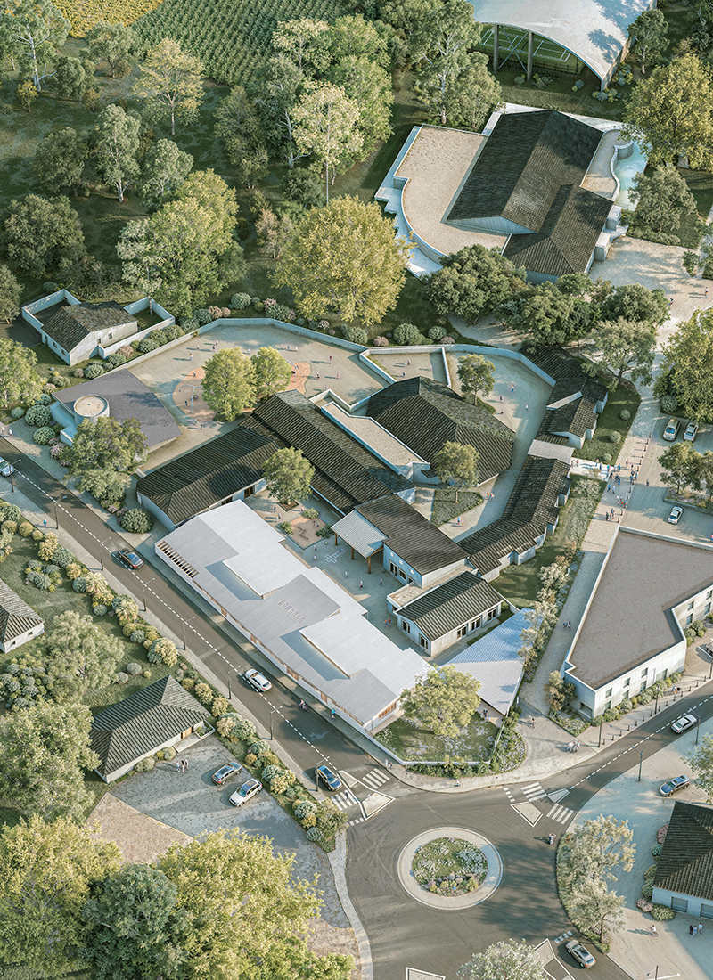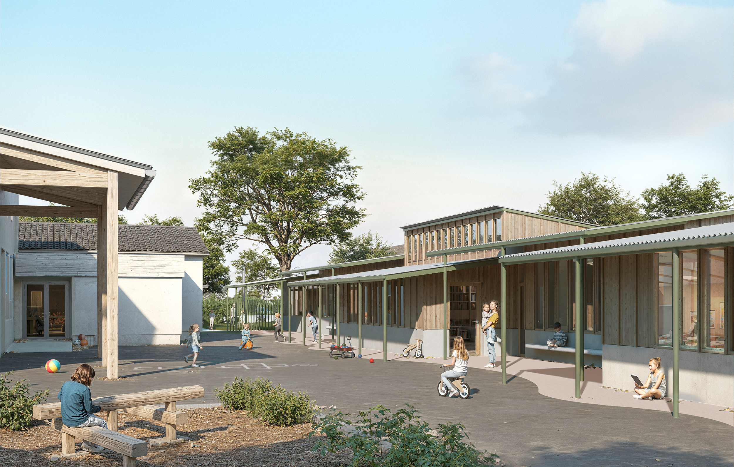 Le nouveau bâtiment se déploie sur une seul et même niveau rez-de-chaussée afin de favoriser l'accès à l'ensemble des salles et la sécurité des enfants en permettant un lien visuel intérieur/extérieur continu. Il s'agit d'un bâtiment en ossature bois et isolation biosourcée.